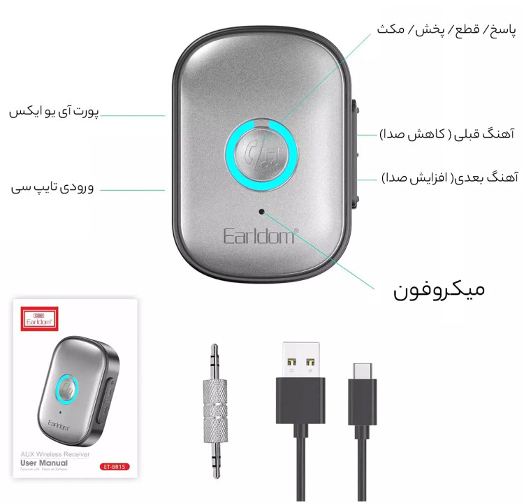 گیرنده موزیک ماشین به پورت 3.5 میلیمتری ضبط متصل میشود و یک ضبط صوت، هدفون یا اسپیکر سیمی را به یک ضبط صوت بلوتوثی، هدفون بلوتوثی و یا اسپیکر بلوتوثی تبدیل میکند. این گجتیکدریافت کننده بلوتوثی است که کاربر را از اتصال سیمی بی نیاز خواهد کرد. بنابراین اگر ضبط خودروی شما از فناوری بلوتوث پشتیبانی نمیکند، لازم نیست هزینههای زیادی برای تهیه یک ضبط صوت مدرن تر را پرداخت کنید. این گیرنده با داشتن فناوری بلوتوث سیستم صوتی بودن بلوتوث را به روز رسانی میکند، به گونه ای که میتوانید وایرلس از آن استفاده کنید.از ویژگی های قابل توجه این محصول کارآمد سازگاری گسترده با لپ تاپ، پخش کننده MP3، سیستم استریو خودرو، هدفون، سیستم استریو خانگی میباشد.با روشن کردن بلوتوث گوشی موبایل خود میتوانید اتصالی میان گوشی و ضبط ماشین برقرار نمایید. گیرنده موزیک ارلدام Earldom BR15 با استفاده از پورت AUX به ضبط یا اسپیکر متصل میشود و کاربران میتوانند با روشن کردن بلوتوث گوشی خود به آن متصل شوند. نسخه بلوتوث این وسیله کاربری، 5.3 است که اتصالی پایدار را تا فاصله 10-15 متر برقرار میسازد. به لطف آن از صدایی با بالاترین کیفیت و کمترین تاخیر برخوردار هستید.دانگل بلوتوث ضبط ماشین ارلدام مدل BR15 دارای باتری داخلی لیتیومی قابل شارژ با ظرفیت 120 میلیآمپرساعت است. این گیرنده با استفاده از درگاه USB-C شارژ میشود که پس از شارژ کامل، میتوانید به مدت طولانی با آن به موسیقی گوش دهید و یا مکالمه کنید.این دستگاه دارای پورت جک ۳.۵ میلیمتری برای اتصال به ورودی AUX دستگاههای صوتی و پورت تایپ سی برای تأمین برق مورد نیاز دستگاه است. همچنین مجهز به یک کارتخوان TF هستند که امکان پخش مستقیم موسیقی از کارت حافظه را فراهم میکند.با استفاده از این گیرنده، میتوانید دستگاههای فاقد بلوتوث را به صورت بیسیم به گوشی هوشمند یا تبلت خود متصل کرده و موسیقی یا محتوای صوتی مورد علاقهتان را پخش کنید.گیرنده صوتی بلوتوثی Earldom BR15 دارای یک میکروفون داخلی است و قابلیت مکالمه دارد. میکروفون داخلی امکان پاسخگویی به تماسها به صورت هندزفری را برای کمک به راحتی شما در رانندگی فراهم می نماید