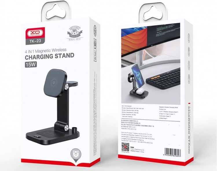 شارژر بی سیم رومیزی 15 وات چهار کاره گوشی، قلم لمسی، اپل واچ و هندزفری بلوتوثی ایکس او TK-23