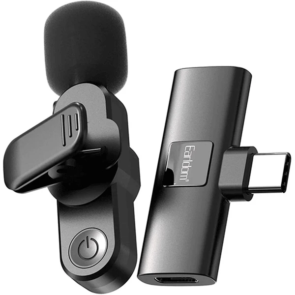 میکروفون بی سیم Earldom Type-C مدل MC7C دارای توری ضد باد، نشانگر میکروفن، پورت شارژ میکروفن، گیره میکروفن، کلید سوئیچ، پورت برای اتصال تلفن، نشانگر گیرنده، پورت گیرنده، سوراخ طناب می باشد.