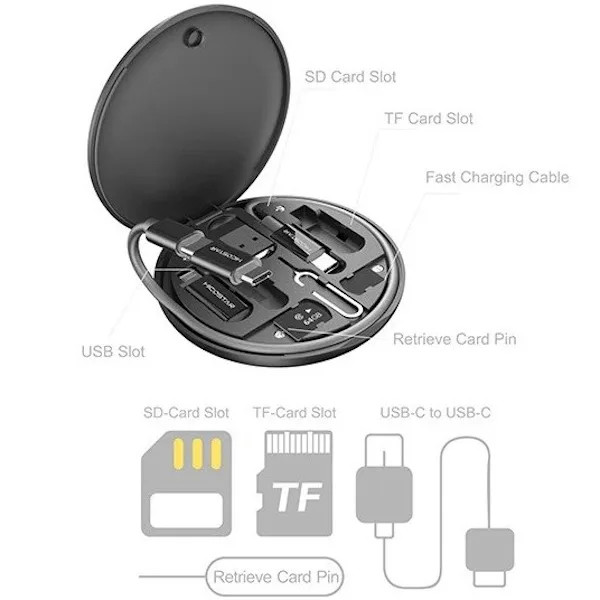 امکان انتقال اطلاعات و شارژ دستگاه های سازگار، دارای 1 شیار حافظه رم SD/ TF و 1 شیار سیم کارت با سوزن سیم کارت