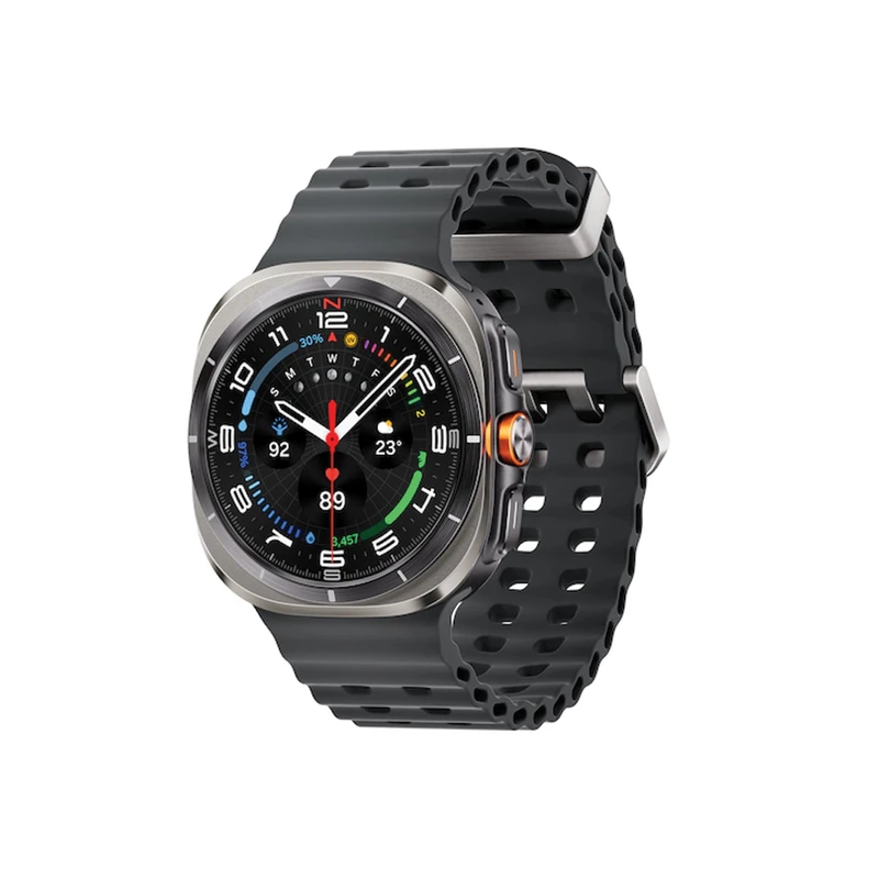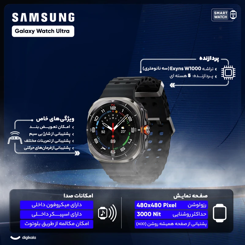 ساعت هوشمند سامسونگ مدل Galaxy Watch Ultra دارای قابلیت های کنترل موسیقی (Music Player)، قابلیت مکالمه از طریق بلوتوث، قابلیت تغییر طرح ساعت یا تم، صفحه همیشه روشن (Always-on Display)، پشتیبانی از دستیار صوتی بند سیلیکون
