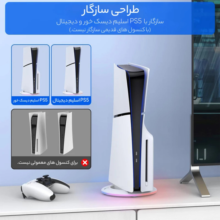 این محصول، یک پایه نگهدارنده کنسول است که با سایر پایه های نگهدارنده تفاوت هایی دارد. این محصول دارای ال ای دی بوده و شما می توانید هنگام بازی از نورهای رنگی و جذاب آن که در محیط گیمینگ شما پخش می شود، لذت ببرید. روی بدنه این محصول یک پورت Type-C دیده می شود. پایه ال ای دی دار اتمسفر پلی استیشن 5 برق مورد نیاز خود را از کنسول ps5 دریافت می کند. با استفاده از کابلی که همراه محصول درون بسته قرار داده شده، پایه ال ای دی دار را به کنسول بازی خود متصل کنید. برای این محصول یک دکمه power لمسی تعبیه شده که در ابتدا برای روشن شدن پایه و سپس برای تغییر حالت پخش نور از آن استفاده می شود. قابلیت نوزدهی این محصول، یک ویژگی متفاوت است که در دیگر پایه های پلی استیشن 5 دیده نمی شود. با استفاده از این قابلیت پایه ال ای دی دار پلی استیشن 5 می تواند حالت و ریتم پخش نورهای رنگی خود را به صورت دالخواه هماهنگ کنید. بنابراین علاوه بر حالت هایی که می توانید به صورت دستی برای پخش نور پایه ال ای دی دار پلی استیشن 5 تنظیم کنید، می توانید از پخش هماهنگ ریتم نورهای رنگی و موسیقی نیز لذت ببرید. برای استفاده از پایه ال ای دی دار پلی استیشن 5 مراحل زیر را انجام دهید: ابتدا پایه نگهدارنده مشکی رنگ داخل بسته بندی کنسول را روی پایه ال ای دی دار قرار دهید.- سپس کنسول پلی استیشن 5 خود را روی پایه قرار دهید. با استفاده از کابل USB/ Type-C پایه ال ای دی دار را به کنسول پلی استیشن 5 متصل کنید. در نهایت با فشار دادن دکمه لمسی power پایه را روشن کنید. با پایه ال ای دی دار پلی استیشن 5 از پخش نورهای رنگی جذاب با ریتم و حالت دلخواه خود در محیط گیمینگ تان لذت ببرید.