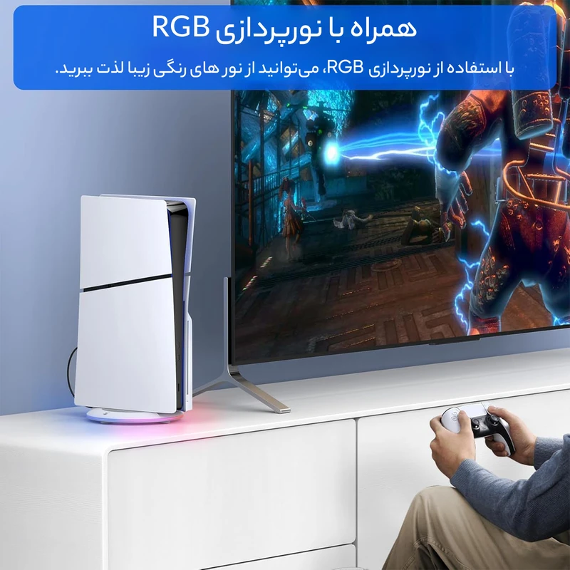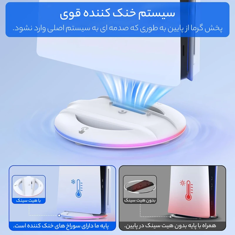 این محصول، یک پایه نگهدارنده کنسول است که با سایر پایه های نگهدارنده تفاوت هایی دارد. این محصول دارای ال ای دی بوده و شما می توانید هنگام بازی از نورهای رنگی و جذاب آن که در محیط گیمینگ شما پخش می شود، لذت ببرید. روی بدنه این محصول یک پورت Type-C دیده می شود. پایه ال ای دی دار اتمسفر پلی استیشن 5 برق مورد نیاز خود را از کنسول ps5 دریافت می کند. با استفاده از کابلی که همراه محصول درون بسته قرار داده شده، پایه ال ای دی دار را به کنسول بازی خود متصل کنید. برای این محصول یک دکمه power لمسی تعبیه شده که در ابتدا برای روشن شدن پایه و سپس برای تغییر حالت پخش نور از آن استفاده می شود. قابلیت نوزدهی این محصول، یک ویژگی متفاوت است که در دیگر پایه های پلی استیشن 5 دیده نمی شود. با استفاده از این قابلیت پایه ال ای دی دار پلی استیشن 5 می تواند حالت و ریتم پخش نورهای رنگی خود را به صورت دالخواه هماهنگ کنید. بنابراین علاوه بر حالت هایی که می توانید به صورت دستی برای پخش نور پایه ال ای دی دار پلی استیشن 5 تنظیم کنید، می توانید از پخش هماهنگ ریتم نورهای رنگی و موسیقی نیز لذت ببرید. برای استفاده از پایه ال ای دی دار پلی استیشن 5 مراحل زیر را انجام دهید: ابتدا پایه نگهدارنده مشکی رنگ داخل بسته بندی کنسول را روی پایه ال ای دی دار قرار دهید.- سپس کنسول پلی استیشن 5 خود را روی پایه قرار دهید. با استفاده از کابل USB/ Type-C پایه ال ای دی دار را به کنسول پلی استیشن 5 متصل کنید. در نهایت با فشار دادن دکمه لمسی power پایه را روشن کنید. با پایه ال ای دی دار پلی استیشن 5 از پخش نورهای رنگی جذاب با ریتم و حالت دلخواه خود در محیط گیمینگ تان لذت ببرید.