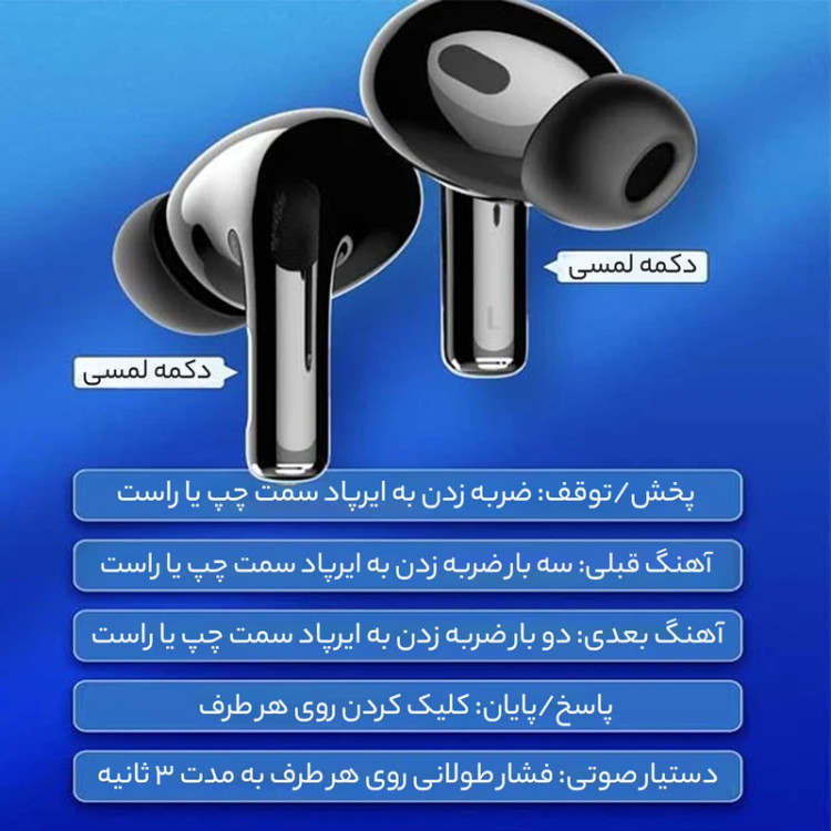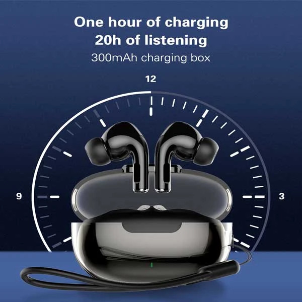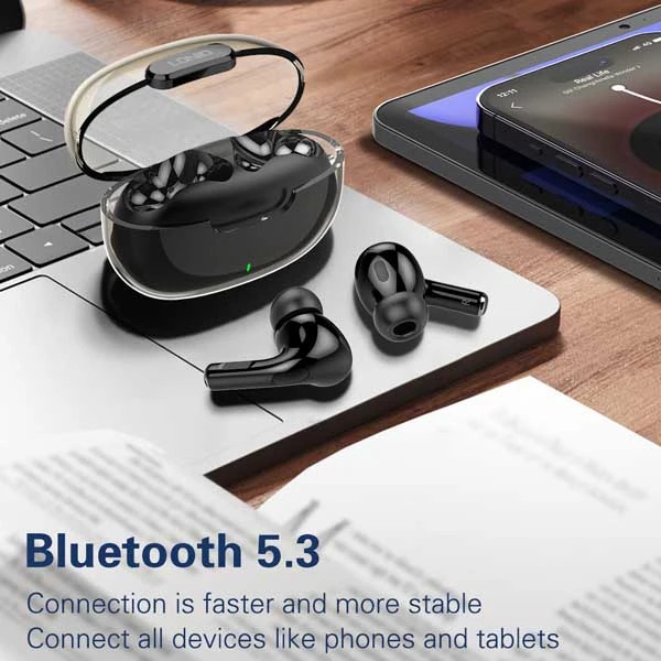 بلوتوث ورژن ۵.۳/ظرفیت باتری باکس ۳۰۰ mAh/پخش HD صدا/درگاه شارژ کیس Type C/دارای دکمه لمسی/ظرفیت باتری هر یک از گوشی ها ۳۰ mAh/مدت زمان پخش ۴ ساعت/حداکثر مسافت جوابدهی بیسیم ۱۰ m/زمان شارژ کامل ۱ ساعت در صورت شارژ کامل گوشیها و کیس تا ۲۰ ساعت PlayTime