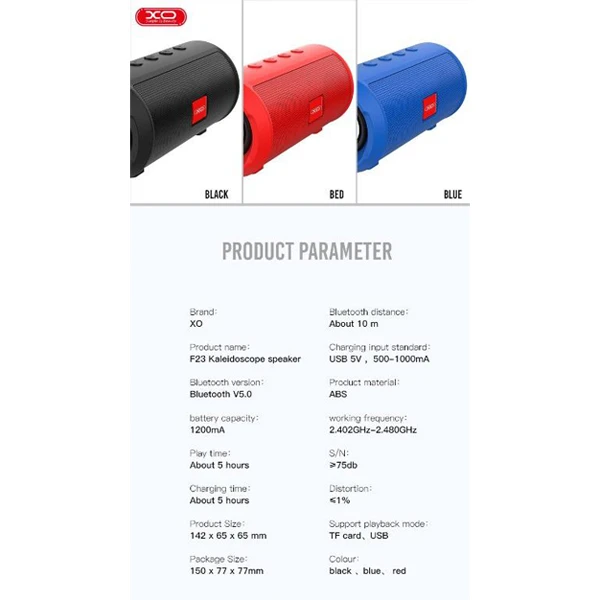 اسپیکر بلوتوثی ایکس او مدل XO F23 از اسپیکر های با کیفیت برند ایکس او میباشد.کیفیت صدای عالی این محصول باعث شده که این اسپیکر جز اسپیکر های پر فروش این برند باشد.این اسپیکر از متریال مقاوم ABS ساخته شده و به راحتی آسیب نمیبیند.شما با این اسپیکر میتوانید 5 ساعت مداوم موزیک گوش دهید و در مکان هایی که به برق شهری دسترسی ندارید از آن استفاده کنید.این دستگاه دارای باتری 1200 میلی آمپری میباشد و از طریق بیسیم و با سیم به گوشی و دیگر دستگاه ها متصل میشود.این اسپیکر ایکس او دارای بلوتوث ورژن 5.0 میباشد.